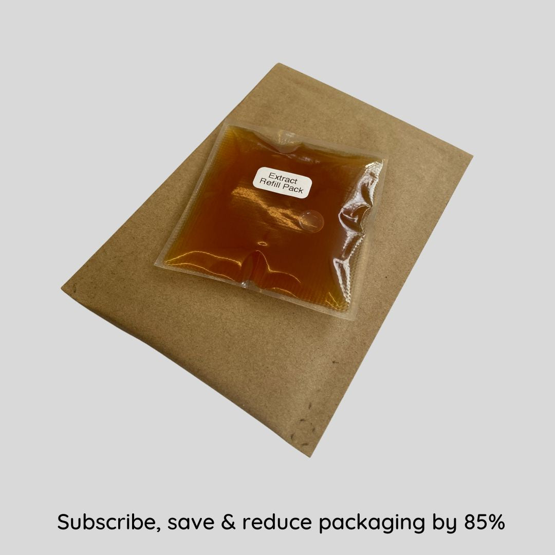 For those who take supplement daily, subscribe and you'll receive your tincture in a reusable glass bottle with your first shipment. Thereafter you'll receive a monthly refill pack of extract that reduces packaging by 85%.